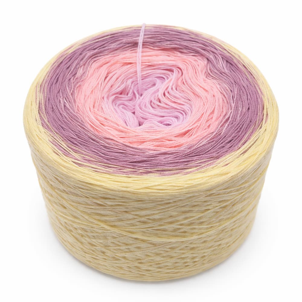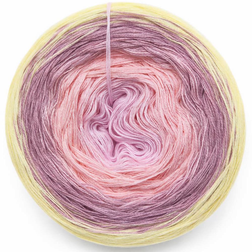 Dieser Farbverlauf entfaltet sich in zarten, hellen Nuancierungen, die sich harmonisch umeinander legen. Vom inneren Bereich mit weichen, warm wirkenden Tönen fließt das Garn in sanfte rosige Abstufungen, die sich allmählich in kühlere, leicht violette Bereiche vertiefen. Der äußere Abschnitt wird von einer hellen, gelblichen Note umrahmt, die dem Verlauf Leichtigkeit verleiht und die Farben sanft ausklingen lässt.